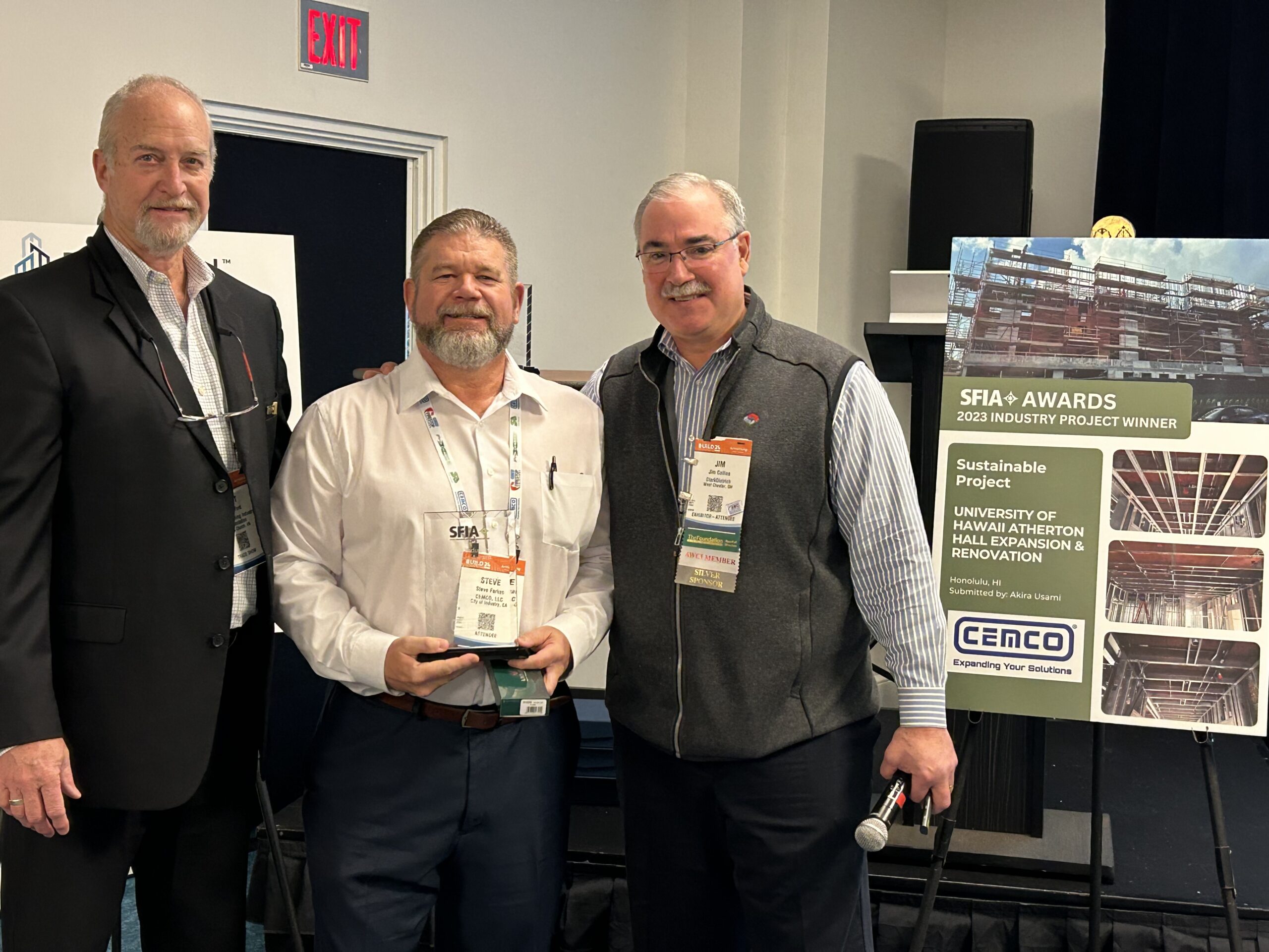 Pat Ford (left), SFIA technical director, and Jim Collins (right), SFIA president, present Steve Farkas of CEMCO with the 2023 SFIA Award for Sustainability on a project at SFIA’s Annual Meeting in March 2024.