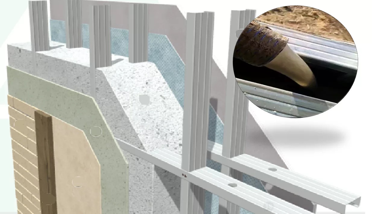 Thermal conductivity has long been a drawback in cold-weather construction. To address this challenge, Scottsdale and its partners have developed a thermally efficient double-wall CFS panel system. The design uses two steel-framed walls formed with C-90 mm profiles, separated by a cavity filled with lightweight, air-entrained concrete.