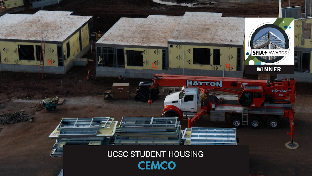 CEMCO received the 2025 SFIA Industry Project and Product Honorable Mention in the Low Rise category for the University of California, Santa Cruz, Student Housing West – Phase 1 Hagar Development. The SFIA Awards recognize excellence in the use of cold-formed steel (CFS) framing across design and construction. Wayne Capers of ADCO Drywall and Metal Framing, the framing subcontractor, submitted the award entry.