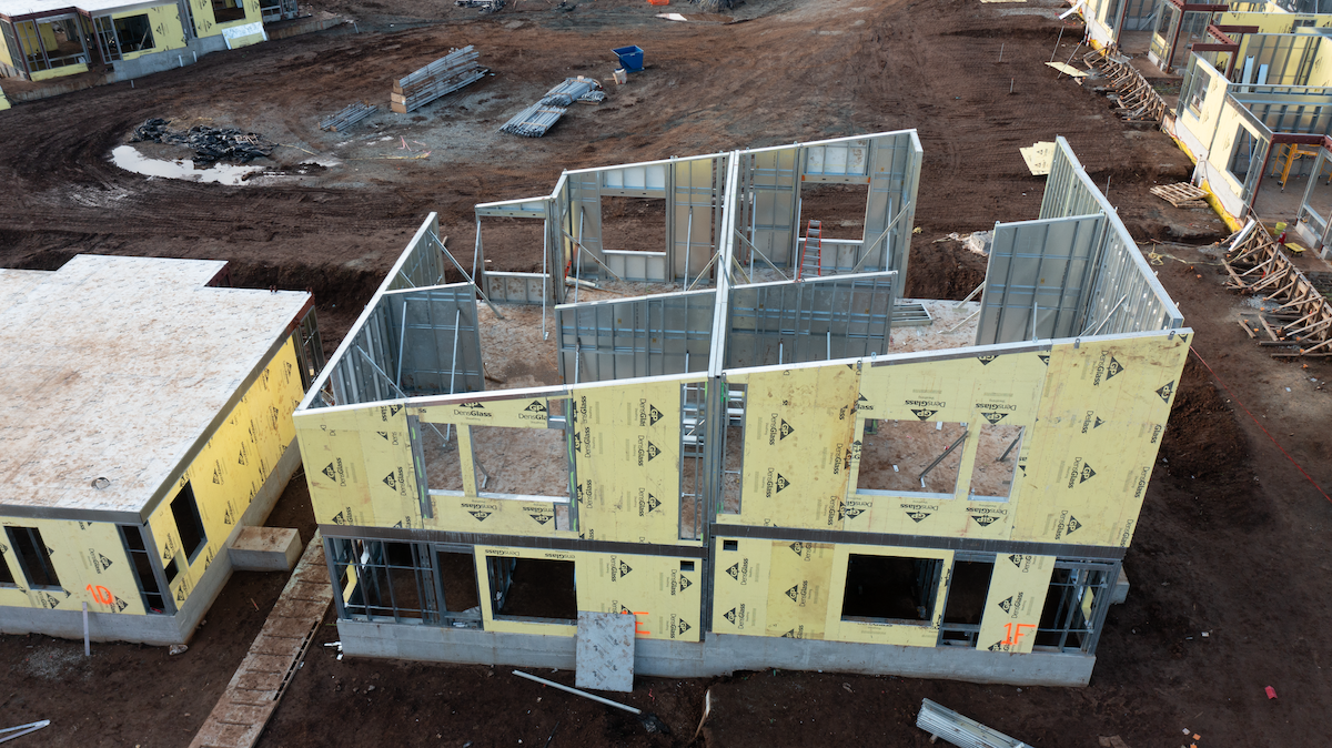 A student family housing unit takes shape as cold-formed steel (CFS) framing and panelized walls come together on-site, reflecting the project’s fast-paced, prefabrication-driven construction approach.