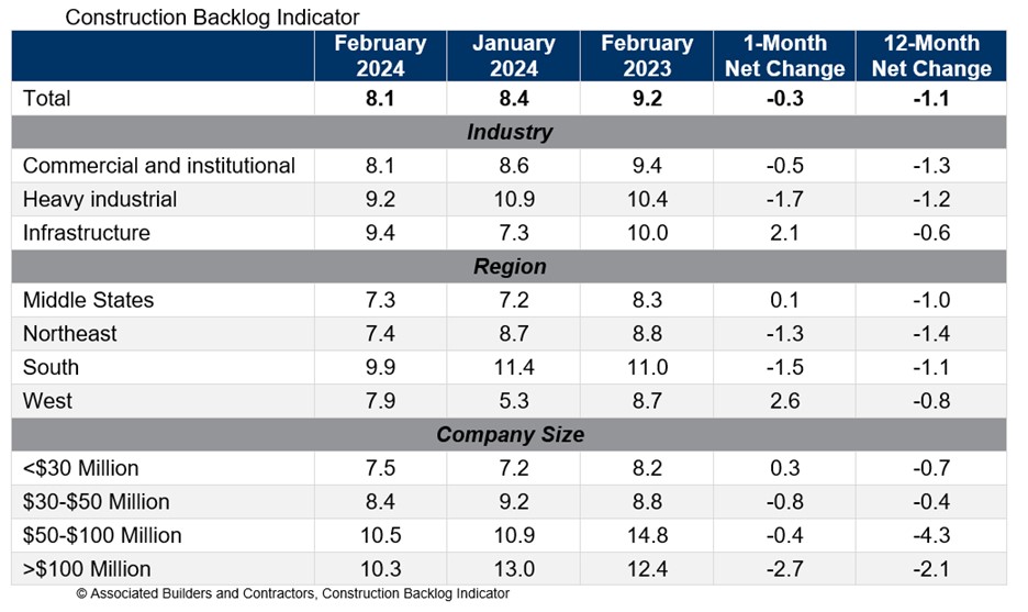 Associated Builders and Contractors reported today that its Construction Backlog Indicator declined to 8.1 months in February, according to an ABC member survey conducted Feb. 20 to March 5. The reading is down 1.1 months from February 2023.