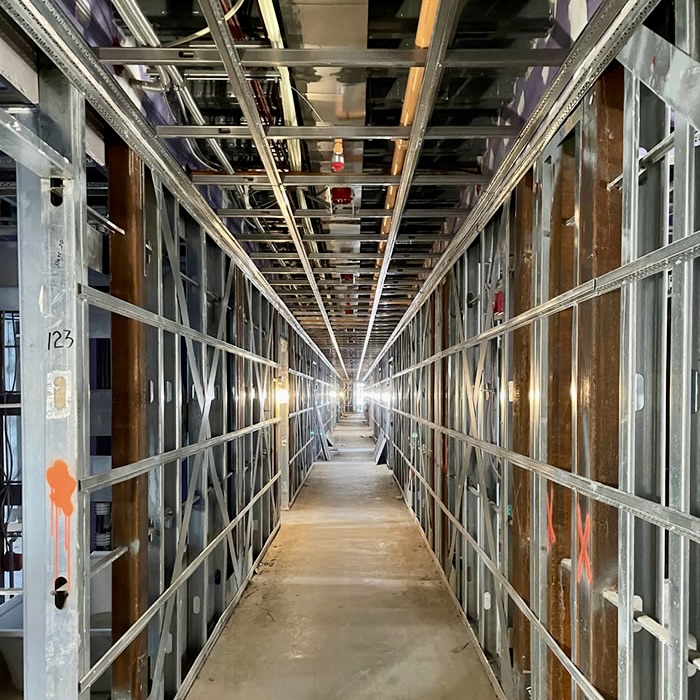 A corridor framed entirely in cold-formed steel (CFS) stretches into the distance, with strap bracing visible along the walls to resist lateral loads.