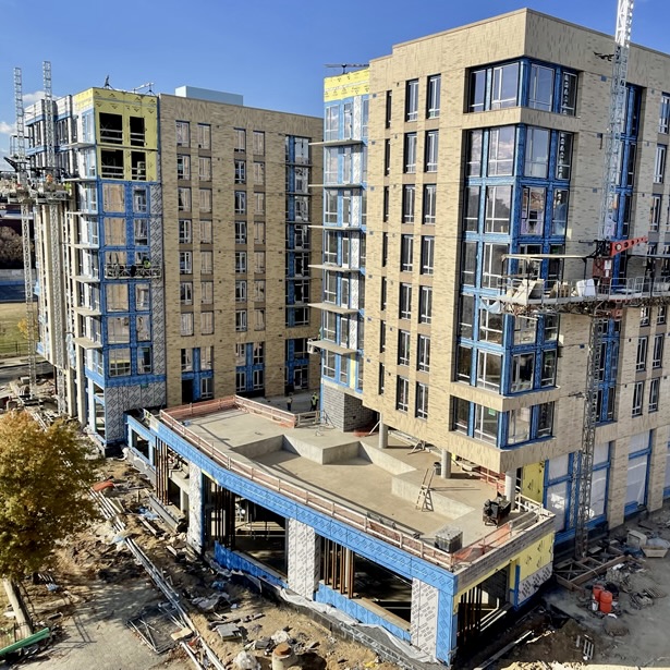Both residential towers near completion as cold-formed steel (CFS) framing gives way to the brick façade and window systems of the Banner Lane Apartments.