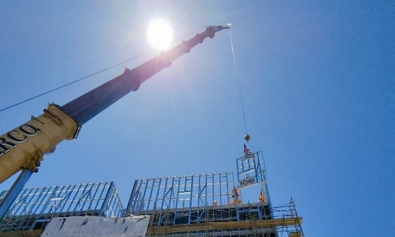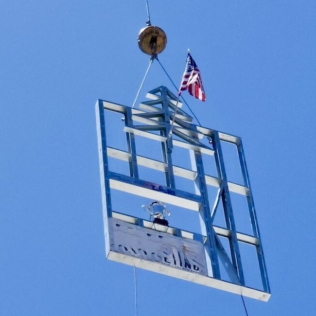 Crews lift the final wall panel into place, topped with a cold-formed steel (CFS) evergreen tree and an American flag.