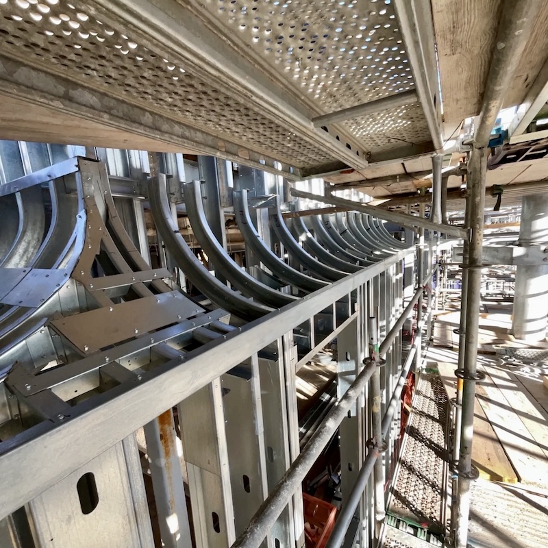 In addition to custom bent tracks, twelve gauge and up to three-inch Flange were required for some of the structural cold-formed metal framing (CFMF) assemblies.