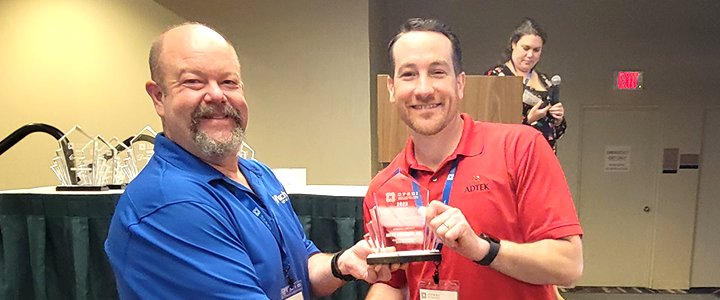 Dana Hennis (left), P.E., S.E., CFSEI vice chair, presents the CFSEI Award to Andrew Newland of ADTEK Engineers.