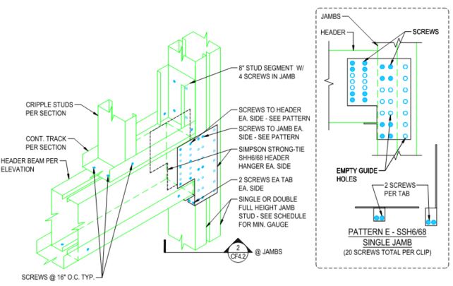 ADTEK specified Simpson Strong-Tie SHH (Steel Header Hanger) clips to eliminate the need for jack studs in short openings.