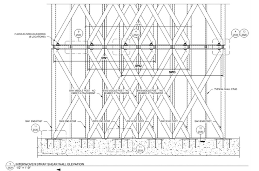 Interwoven shear wall elevation detail highlighting a design solution for podium-level constraints.