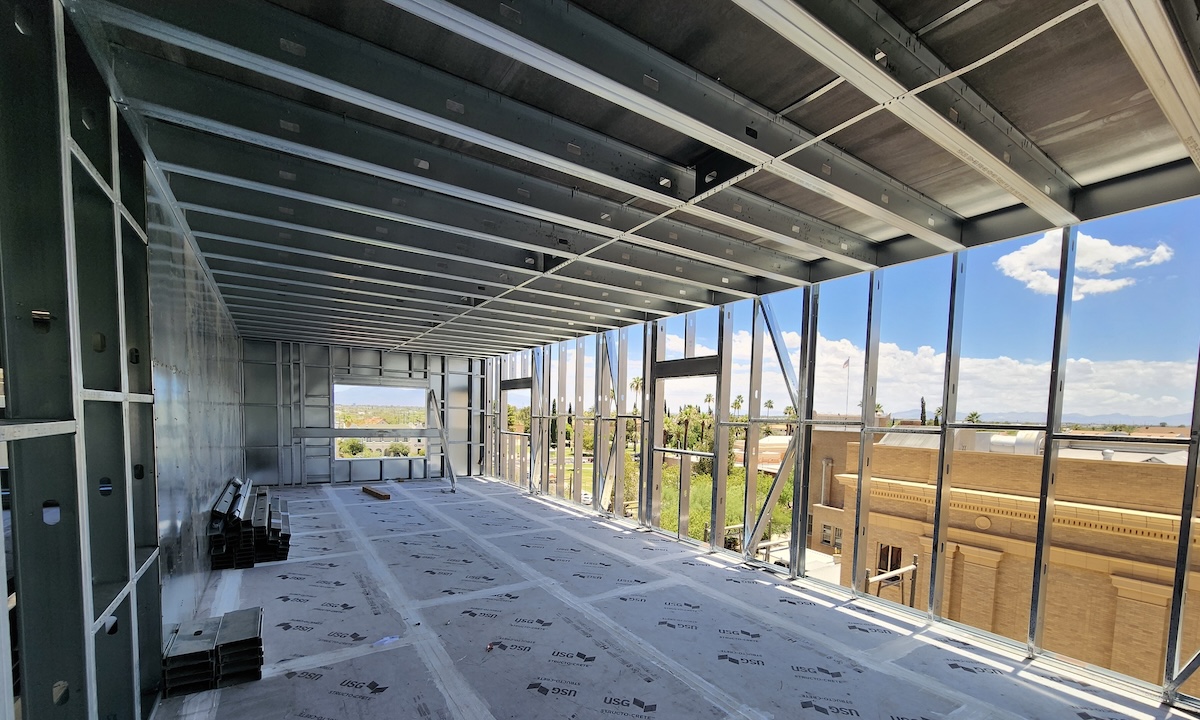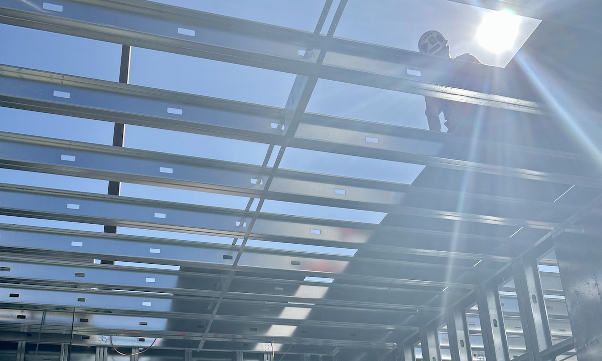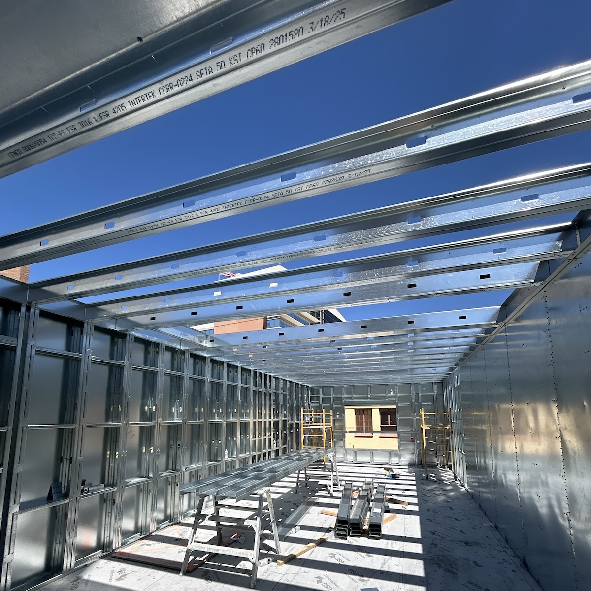 The prefabricated cold-formed steel (CFS) wall panels and kitted precut CFS floor framing were delivered and installed on a just-in-time basis.