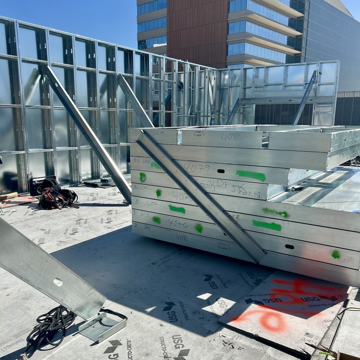 The framing solution included prefabricated wall panels and kitted precut CFS floor framing, all produced using CNC rollforming technology, fabricated, delivered and installed on a just-in-time basis by Tori Contracting. Without needing space for staging or material laydown, the project advanced upward efficiently — maintaining site safety, streamlining workflow control and reducing the delays and costs of securing off-site storage near the constrained downtown lot.