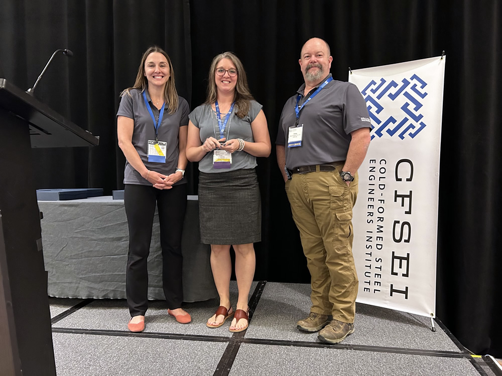 Tammy Gleed (left), P.E., 2024-25 CFSEI vice chair, and Dana Hennis (right), P.E., 2024-25 CFSEI chair, present the 2024 CFSEI Creative Detail, Second Place Award to Jamie John, P.E., Excel Engineering, at the 2024 CFSEI Expo.