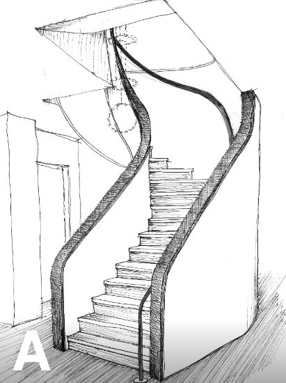 Hand sketched drawing of a curved staircase to be built with cold-formed steel (CFS) framing for the DNS Capital project in Chicago.
