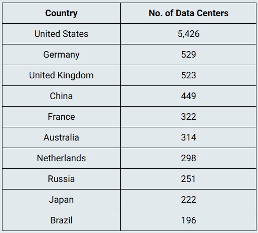 The top 10 countries with the highest number of data centers.