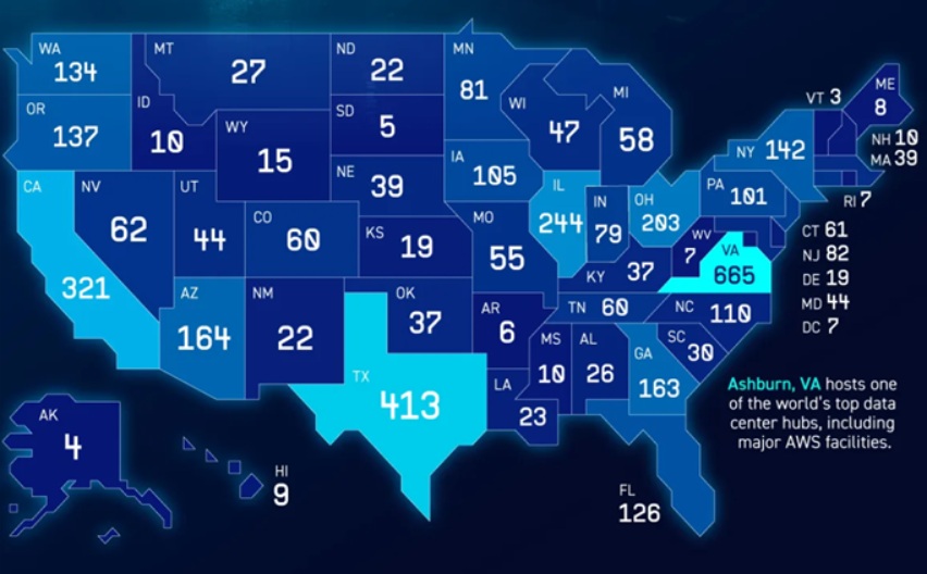The distribution of data centers in the US in 2025