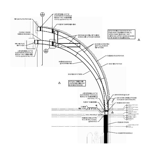 The compression ring at the top of the half dome was not permitted to penetrate the brick finish. To laterally support the half dome, the interior finish dome was used, since it was a separate curved surface.