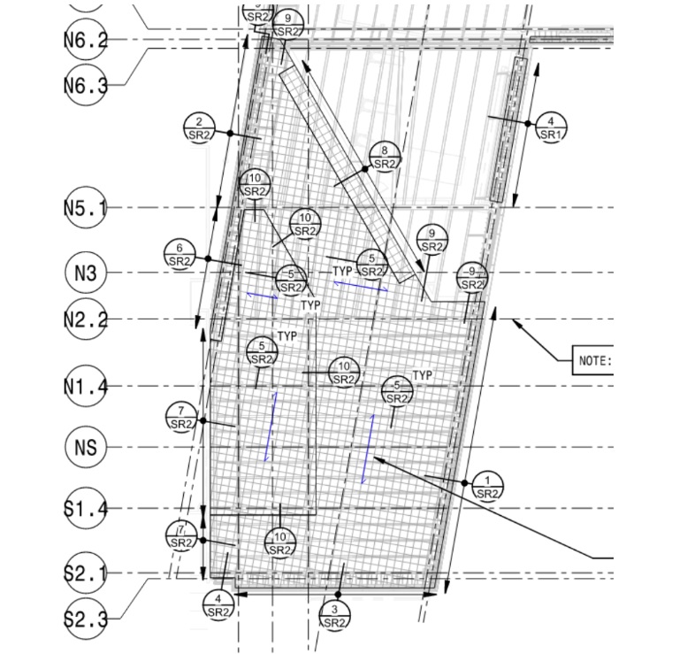 This plan view illustrates the amount of required span direction changes and special detail conditions at the drive thru ceiling.