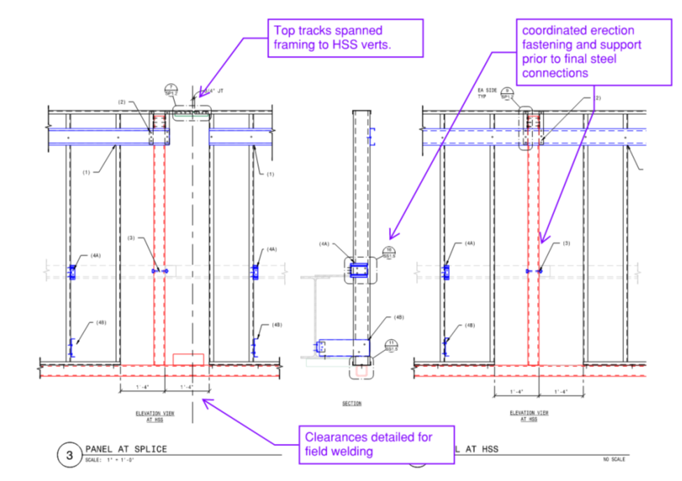 Additionally, CFS framing needed to be kept away from critical connection locations to allow field welding of the steel. These “no-fly” zones were typically the standard CFS anchorage locations to the steel. So, modified connection detailing was required.