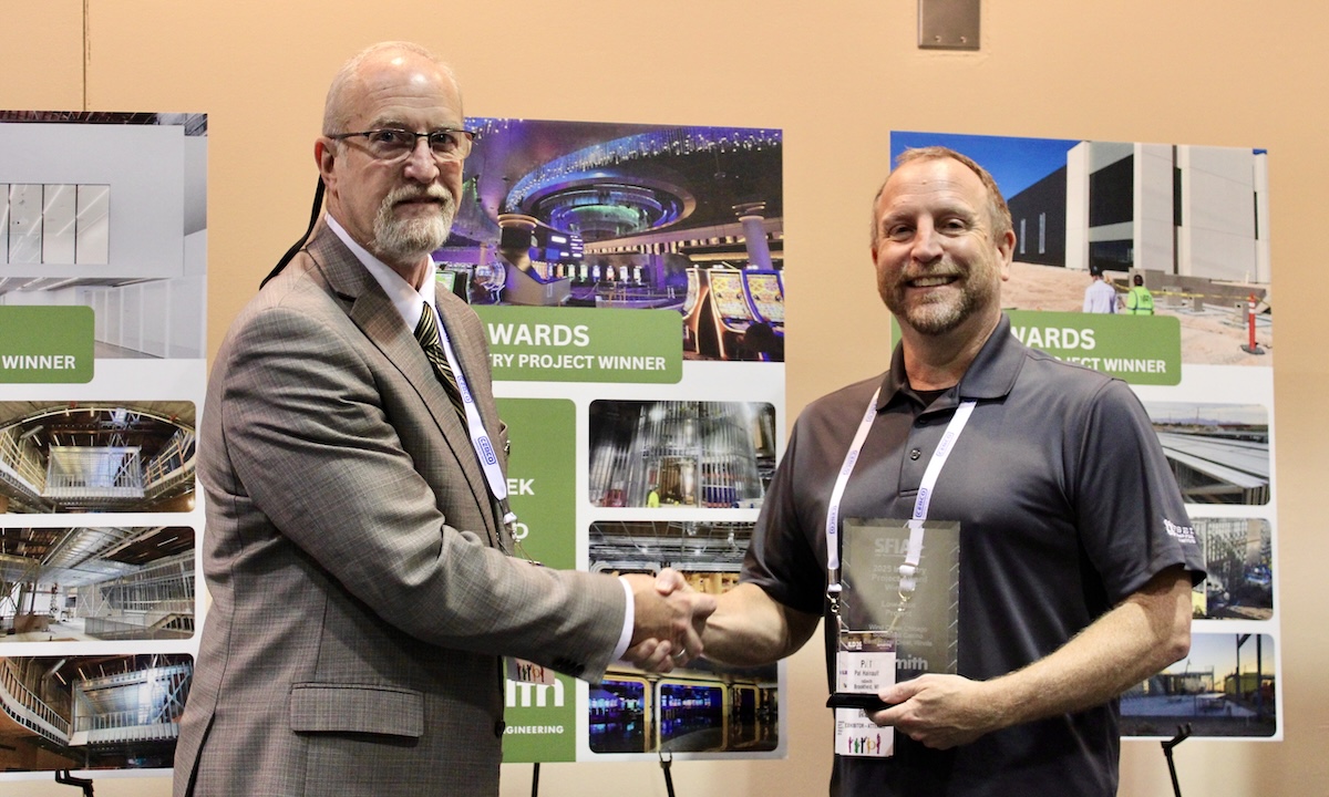 At right, Pat Hainault of raSmith accepts the 2025 Steel Framing Industry Association (SFIA) 2025 Low-Rise Project Award from SFIA Technical Director Pat Ford during the 2026 SFIA General Session in New Orleans.