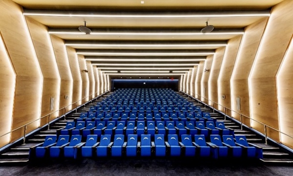 The auditorium shows the engineered cold-formed steel (CFS) ceiling grid, which uses vertical, angled and horizontal members to achieve the room’s undulating form.
