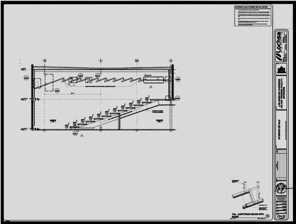 Lochsa engineered the auditorium’s cold-formed steel (CFS) ceiling and wall system to create continuous angular planes that deliver the LA Chargers’ lightning-bolt aesthetic while housing recessed lighting.