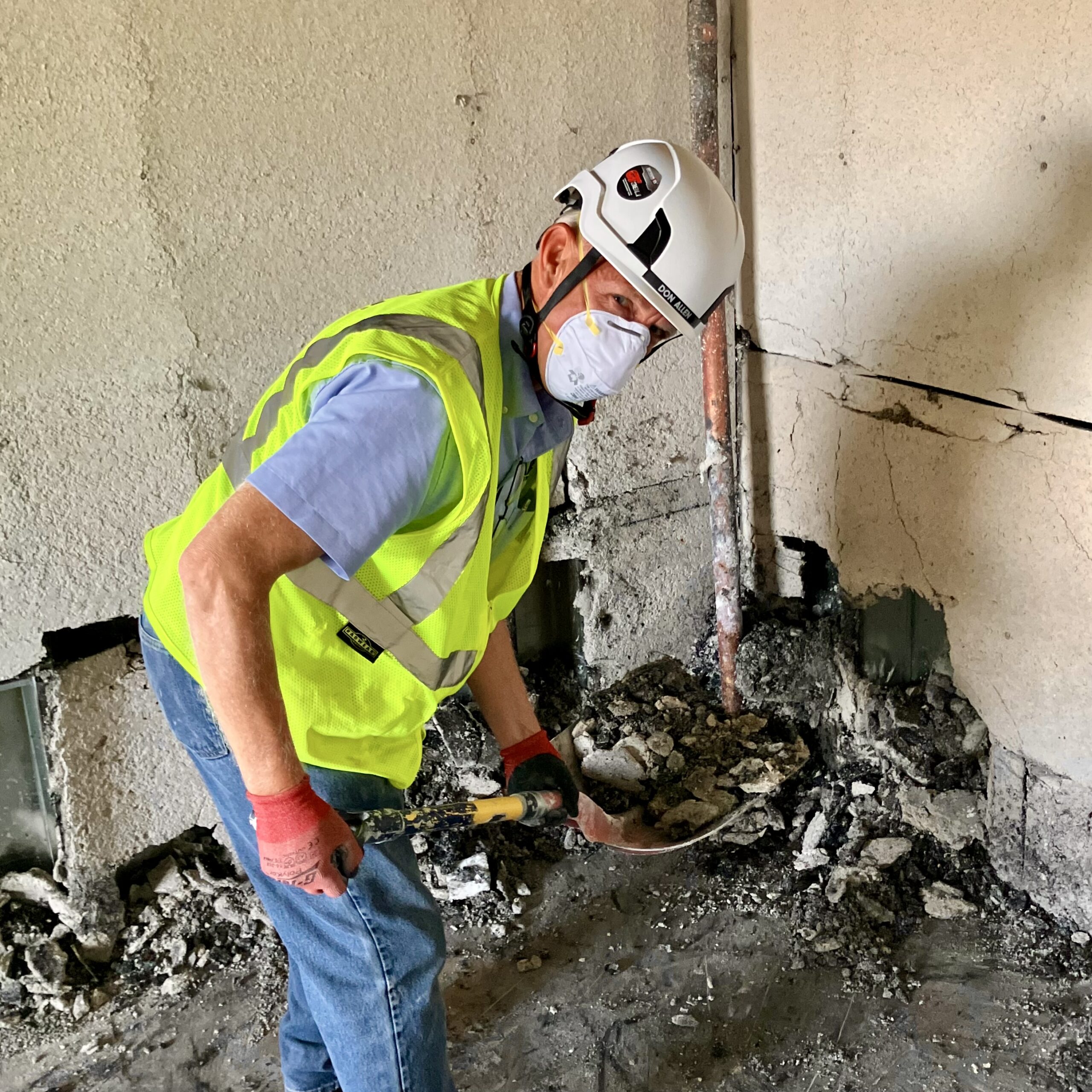 Post-burn cleanup: SFIA Executive Director Don Allen helps shovel ash and soot inside CFS10, clearing the burn room so researchers can document damage and retrieve sensors for analysis.