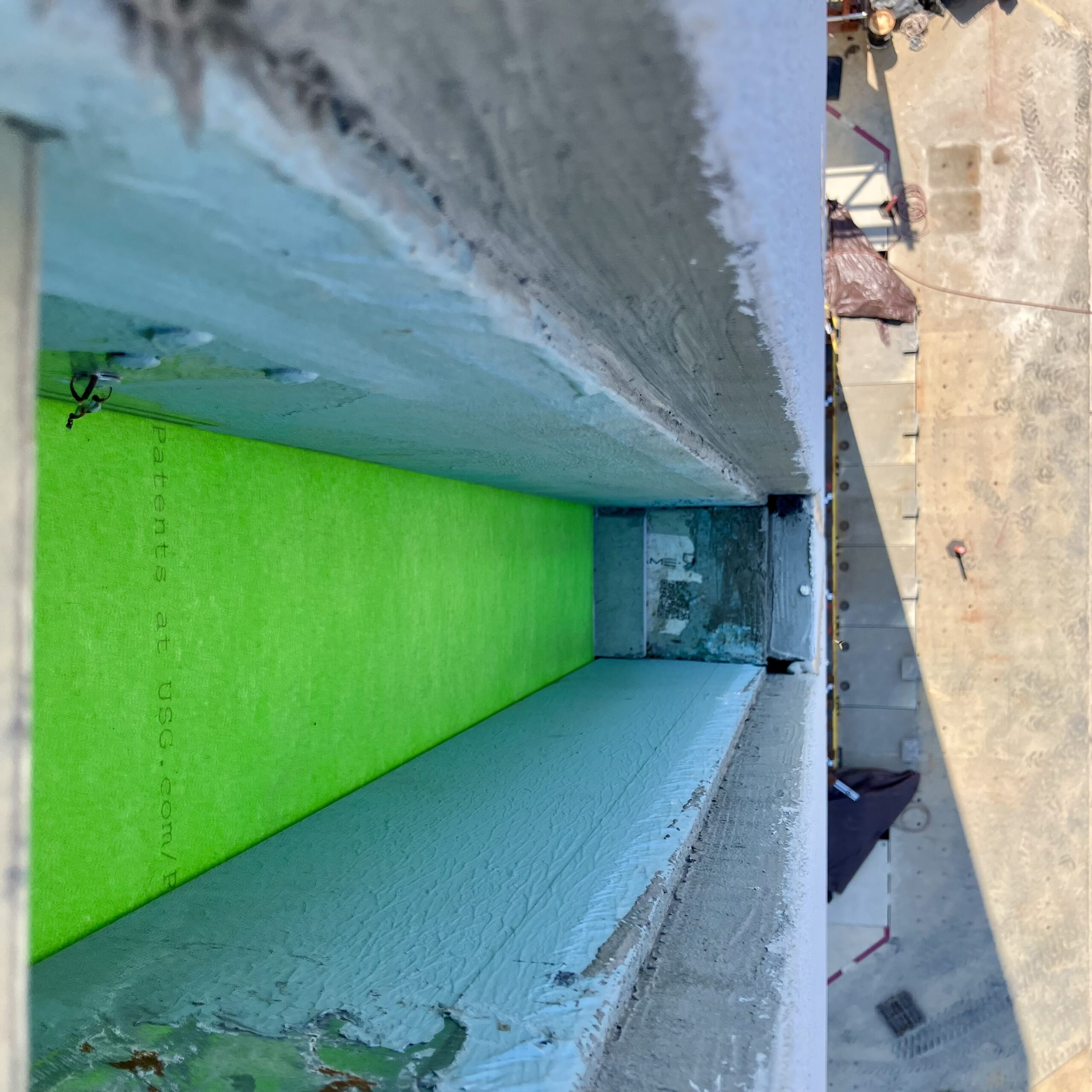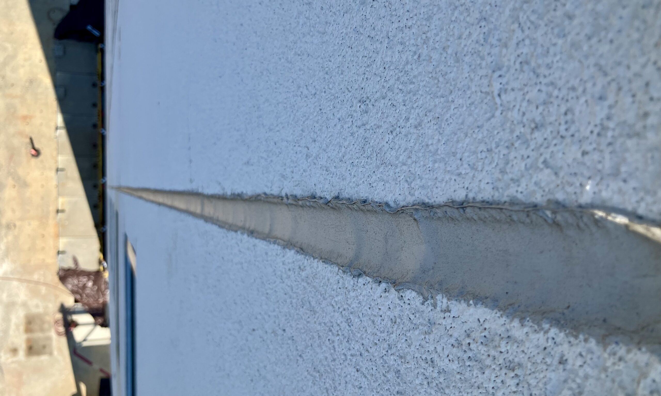 Looking down from the roof before the burn, the joint between EIFS-clad exterior wall panels on CFS10 is intact and uncracked after the seismic tests and before the burn tests.