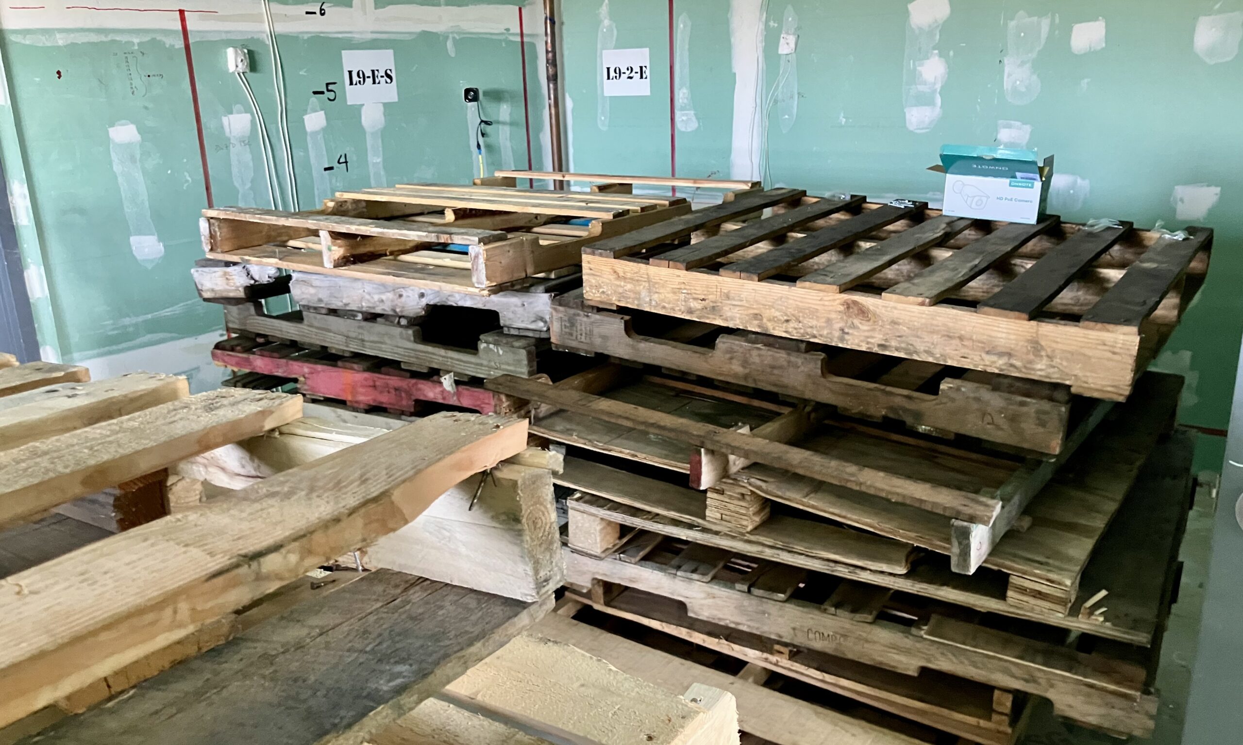Wood pallets staged as the fuel package for CFS10’s live-fire test provided a controlled heat release to evaluate compartment temperatures, smoke movement and structural response in real time. Thermocouples and height markings can be seen on the walls.