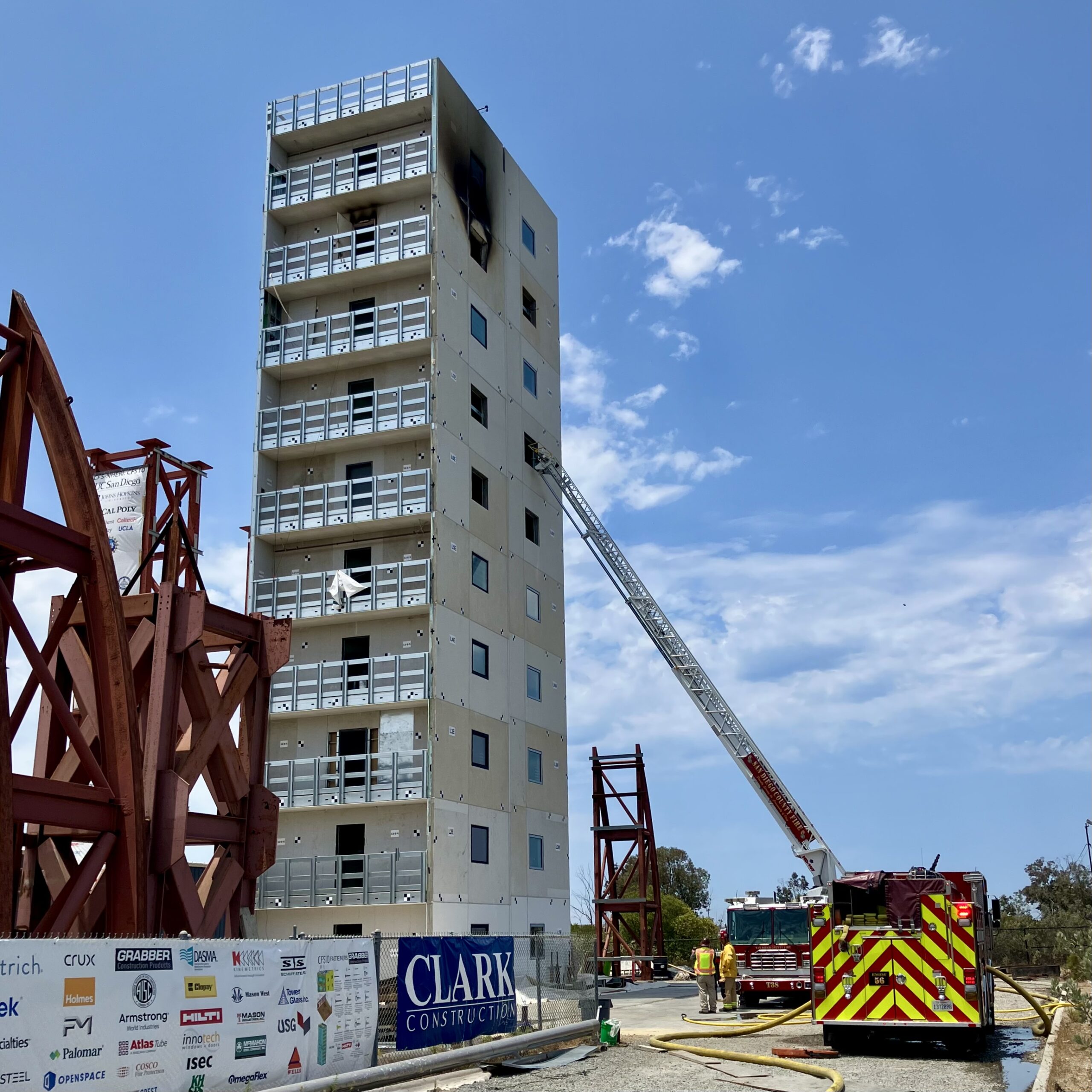 After withstanding 18 earthquake simulations on UC San Diego’s outdoor shake table, the 10-story CFS10 building — the tallest cold-formed steel (CFS) framed structure ever placed on an earthquake simulator — advanced to its next trial: controlled, post-earthquake fire testing designed to study compartment fire behavior and recovery for mid-rise CFS construction.