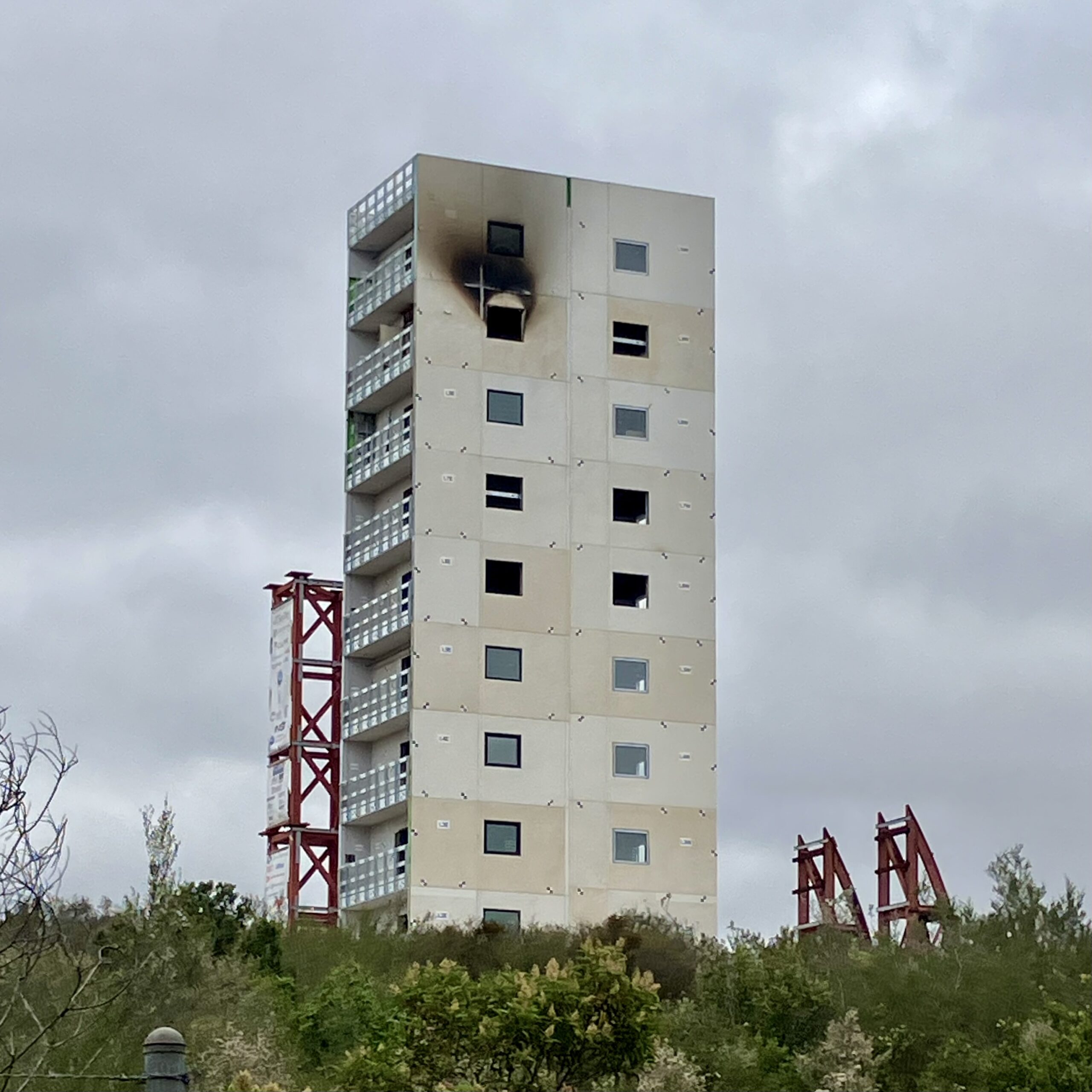 From a distance, the 10-story CFS10 shows a soot-darkened opening, evidence of smoke venting and heat from the controlled fire test. The opening’s steel framing was exposed to the flames, while the burn chamber’s hallway door and balcony remained closed.