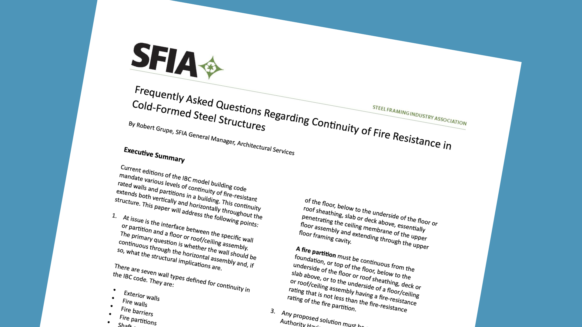 That’s the challenge addressed in a new Steel Framing Industry Association (SFIA) white paper, Frequently Asked Questions Regarding Continuity of Fire Resistance in Cold-Formed Steel Structures (SFIA F101-25), authored by Robert Grupe, SFIA general manager of architectural services.