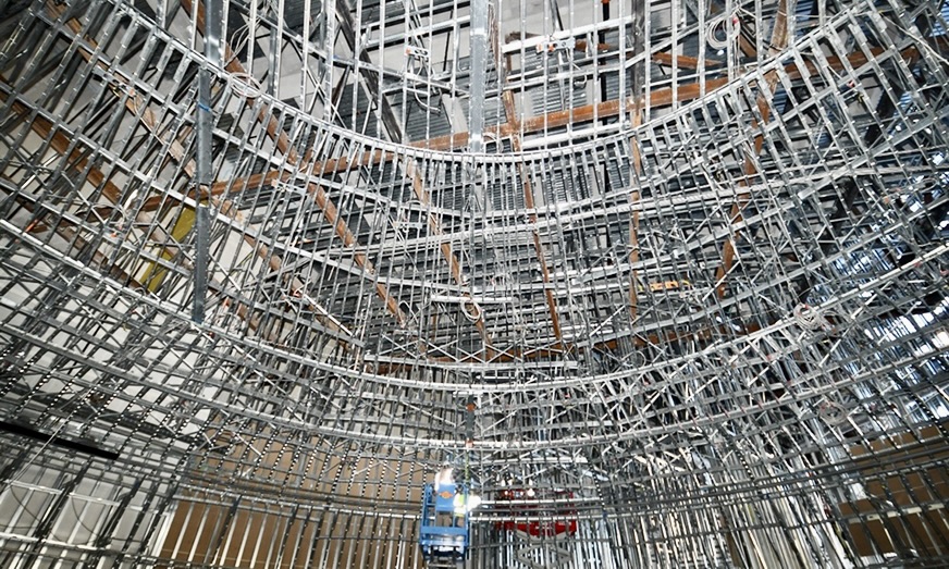 The curved cold-formed steel (CFS) ceiling and wall panels for Project Blue — the structural steel framework of beams and bar joists in the lobby at Fontainebleau Las Vegas, Las Vegas, Nevada.