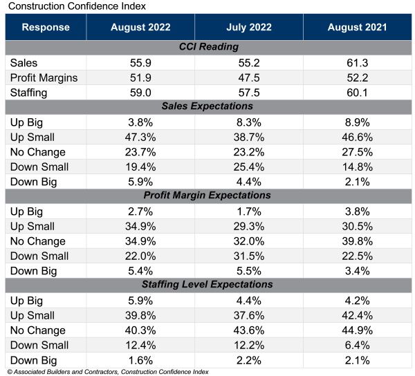 ABC’s Construction Confidence Index readings for sales, profit margins and staffing levels increased in August. The index for profit margins bounced back into positive territory while the sales and staffing level indices remained above 50, indicating expectations of growth over the next six months.